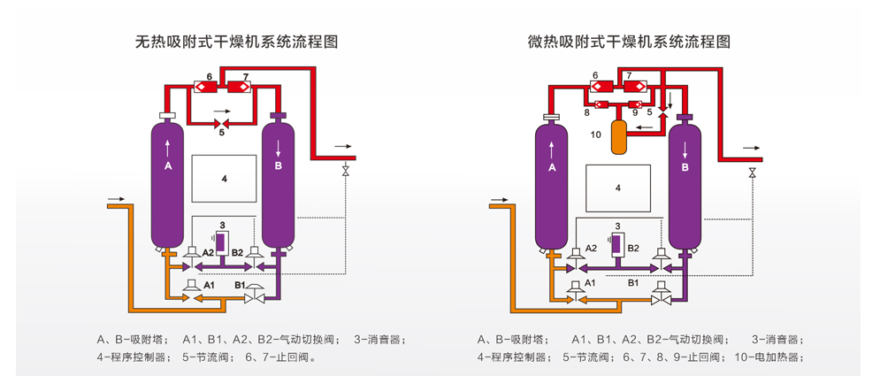 穩(wěn)定一致的出氣壓力和低露點:特有的氧化鋁、分子篩配比分層技術,使空氣首先經(jīng)過氧化鋁進行初步干燥,降低空氣中的含水量后,再經(jīng)過分子篩做深度干燥,達到更低露點的空氣品質(zhì)。合適的塔體尺寸和上游干燥、下游再生的對流方式,無熱再生排氣量小于 14%,微熱再生排氣量僅為 5%,避免吸附劑流化和吸附劑層受污染。